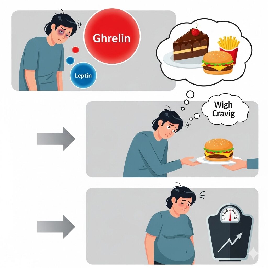 - 睡眠不足 → レプチン(満腹ホルモン)↓、グレリン(食欲ホルモン)↑