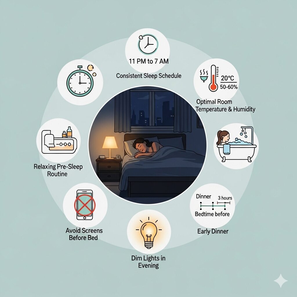 - 夕食:就寝3時間前までに済ませ、消化を軽くする