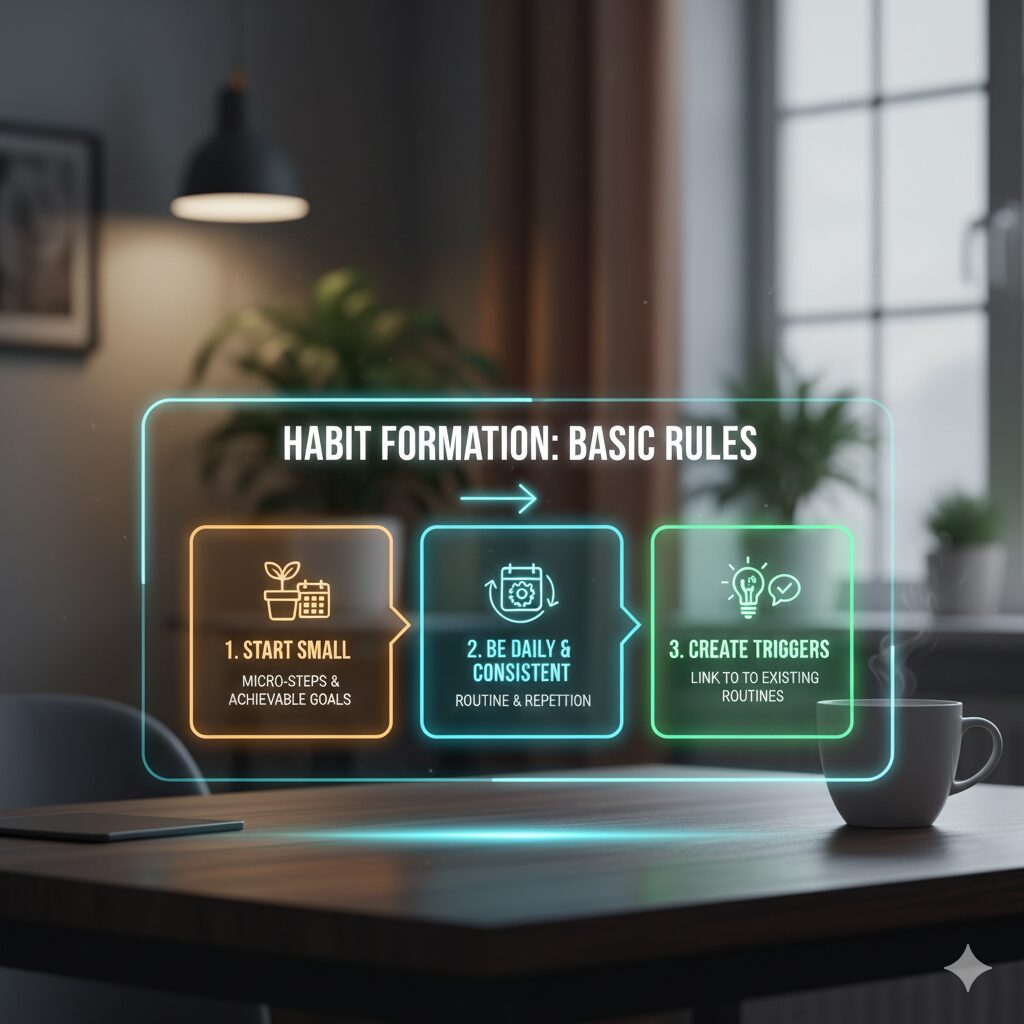 - 行動心理学でも「トリガー(きっかけ)+ルーティン(行動)+報酬(ご褒美)」が習慣化の流れ。